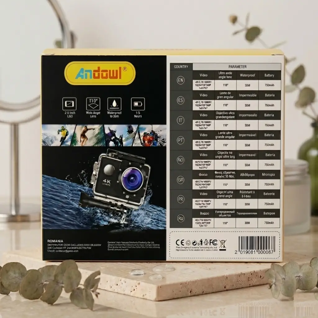 Feature Specification Brand Andowl Model Q-K999 Video Resolution 4K / 2.7K / 1080P HD / 720P Screen Size 2.0 Inch LCD Lens Angle 110° Ultra Wide Angle Waterproof Rating Up to 30 Meters (with included casing) Battery Capacity 750mAh (Rechargeable) Battery Life Approx. 1.5 Hours continuous shooting Connectivity Built-in WiFi Application Extreme sports, underwater filming, vlogging